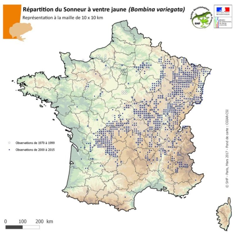 Le Sonneur à ventre jaune (Bombina variegata) ou simou en Occitan est un amphibien du centre de l’Europe d’affinité climatique continentale. Comme tous les amphibiens, l’espèce est protégée. A ce titre tout prélèvement d’individu (adulte, ponte, larve) et toute destruction de son habitat sont strictement interdits. Il est classée « en danger » sur la liste rouge régionale.